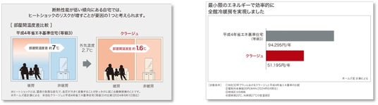 ▲省エネ基準住宅とクラージュの部屋間温度差比較 ▲省エネ基準住宅とクラージュの冷暖房費比較