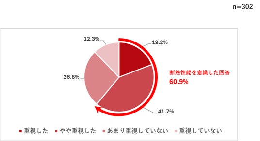 – 一方で、現在の住まいを決める際に、断熱性能の高さを重視した人は「重視した」「やや重視した」を合わせて全体の約6割(60.9%)という結果に