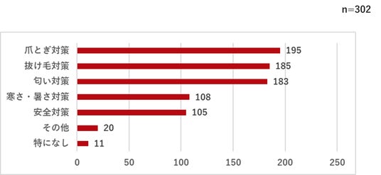 猫を飼っている人の住宅に関するお悩みは、1位は「爪とぎ対策」(195回答)、2位「抜け毛対策」(185回答)、3位「匂い対策」(183回答)、4位「寒さ・暑さ対策」(108回答)、5位「安全性」(105回答)と大きな差はつかず、様々なお悩みを抱えていることがわかりました。