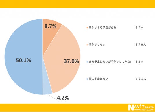 バレンタインの本気度が見える手作りについてのアンケートです。お菓子を手作りする予定はありますか?というアンケートでは「手作りする予定がある」と回答された人が、意外と少なく8.7%という結果でした。「まだ予定はないが手作りしてみたい」と回答した人は4.2%という結果で、手作りをしないや贈る予定がないと回答した人が圧倒的に多いという結果になりました。