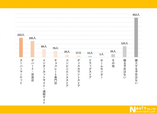 バレンタインの贈り物をどこで購入するかのアンケートです。「スーパーマーケット」で購入される人が1番多く222人という結果になりました。次に多かったのが「デパート・百貨店」で185人、3番目が「インターネットサイト・通販サイト」で89人という結果になりました。