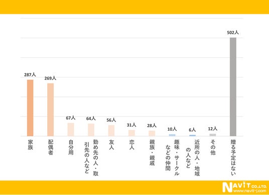 今回のアンケートは複数回答でいただきました。バレンタインは誰に贈り物をするかというアンケートで1番多かったのは「家族」で287人、「配偶者」が次に多く269人、3番目に多かったのは「自分用」で67人となりました。