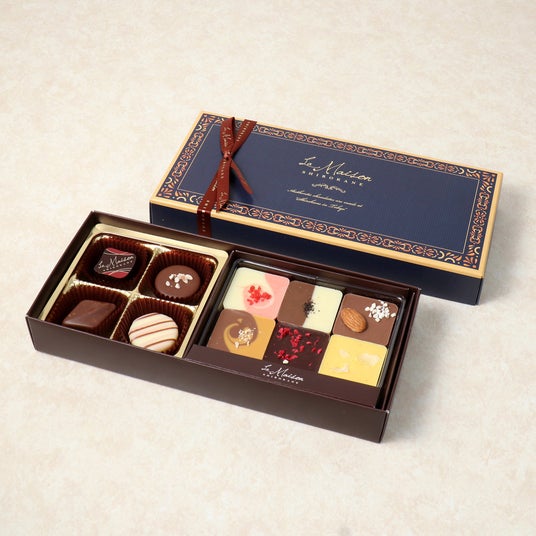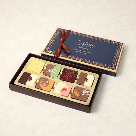 ショコラの味わいを楽しめるビターガナッシュやコクのあるピスタチオ風味のガナッシュ、甘酸っぱいストロベリーのホワイトガナッシュなど、一箱で様々なフレーバーをご堪能いただけます。