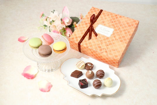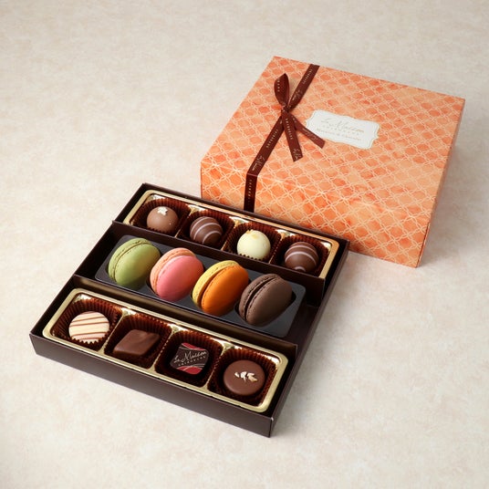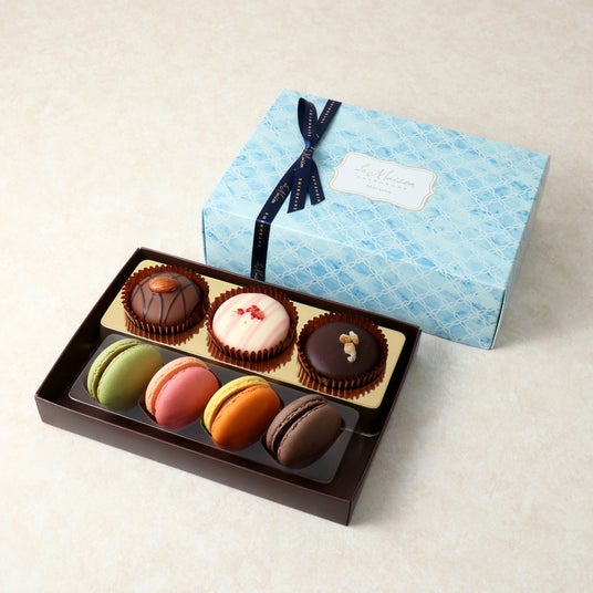 マカロン、白金ショコラ、和紅茶と果実のトリュフを入れた贅沢なアソートボックス。