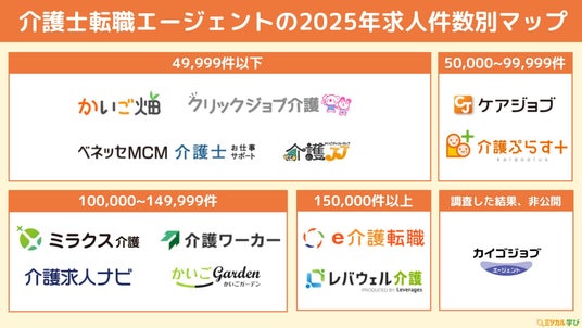 介護士転職エージェントを取扱い件数ごと(公表されている数値)別に分類したカオスマップです。