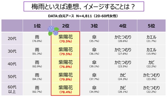今回、当社がさらなる市場の活性化を図るために独自に調査したところ、ダニが発生しやすい高温多湿の時季である梅雨のイメージとして紫陽花を挙げる方が多いことが分かりました(下図参照)。