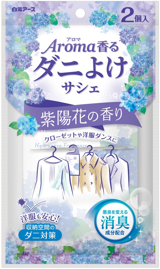 そこで、『アロマ香る ダニよけサシェ 紫陽花の香り』を数量限定で発売いたします。香料に天然アロマ成分を使用した瑞々しい紫陽花の香りが収納空間内にふわっと広がります。さらに、消臭成分配合で、収納空間にこもったニオイ※2を消臭します。