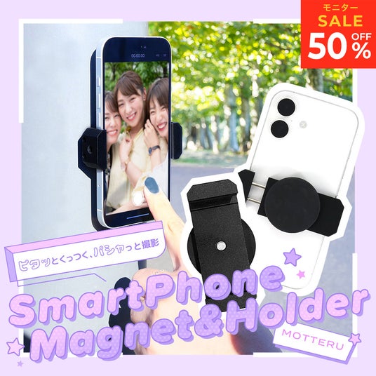 スマートフォン マグネットホルダー (MOT-SPSTD14)スマホを挟んで固定し、マグネットでくっつけるだけで、簡単に自撮りで写真・動画撮影ができるホルダーです。