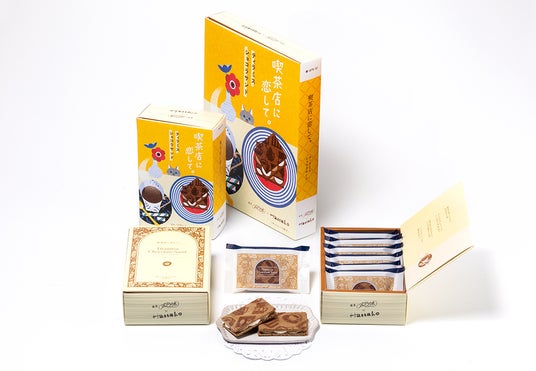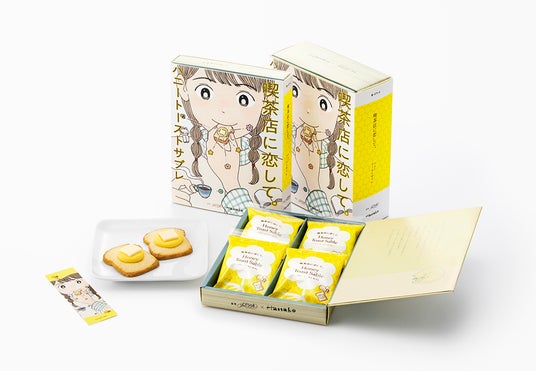 『喫茶店に恋して。』の世界を満喫できる“喫茶スイーツボックス”も登場。ブランド誕生から人気の『ティラミスショコラサンド』、パリとろ食感がたまらない『クレームブリュレタルト』、そして最新作の『ハニートーストサブレ』を一度に楽しめるレトロ可愛いセットです。キュートなモチーフの数々は人気イラストレーターの進藤恵子さんによるイラスト。どこか見覚えのある喫茶店の風景や懐かしい思い出が詰まった、喫茶ファン必見のスイーツボックスです。