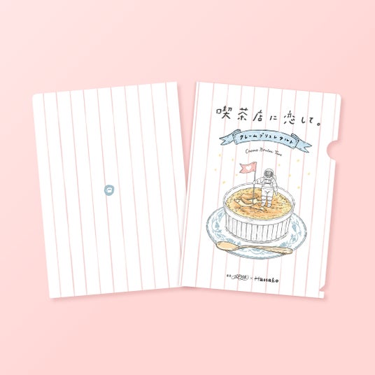 代表作『クレームブリュレタルト』の世界がクリアファイルに!デザインのテーマは、「喫茶店に広がる宇宙」。表紙には人気イラストレーターの酒井真織さんが書き下ろした、クレームブリュレにパリンッと旗を立てる宇宙飛行士。とてもキュート。