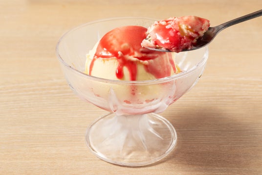 甘酸っぱい美酢ザクロソースをかけた爽やかなバニラアイスです。辛いもの食べた後の〆はコレに決まり!