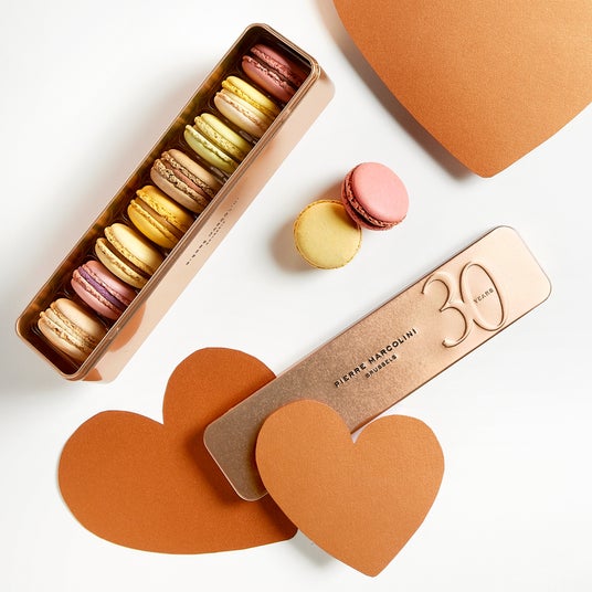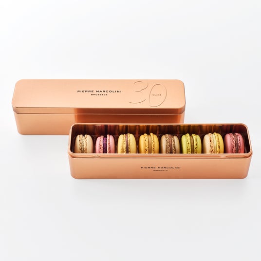 ヨーロッパの伝統菓子に、ピエール マルコリーニのセンスとこだわりを掛け合わせて完成されたマカロン。このBOX限定の「カシス」を含む8種をブランド30周年を記念した限定のコッパーカラーのパッケージに詰め合わせました。