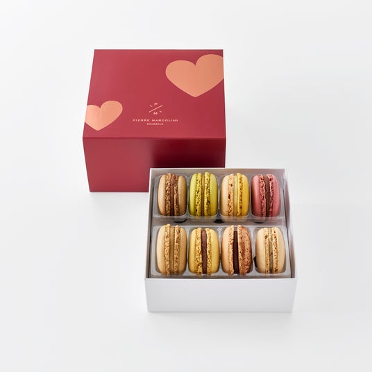 ヨーロッパの伝統菓子に、ピエール マルコリーニのセンスとこだわりを掛け合わせて完成されたマカロンを、今年のホワイトデーコレクションのテーマ「Surprise Surprise」のモチーフが施されたパッケージに詰め合わせました。サクサクした生地の歯応え、滑らかなガナッシュやクリームの風味をお楽しみください。