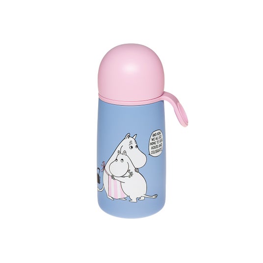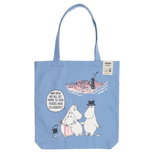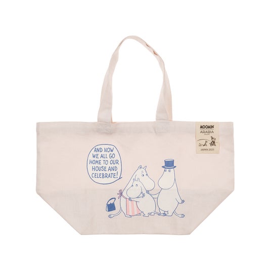 メインのイラストは家族が抱き合うシーンで、背景には青いムーミンやしきが描かれ、煙突から歓迎の煙が上がっています。