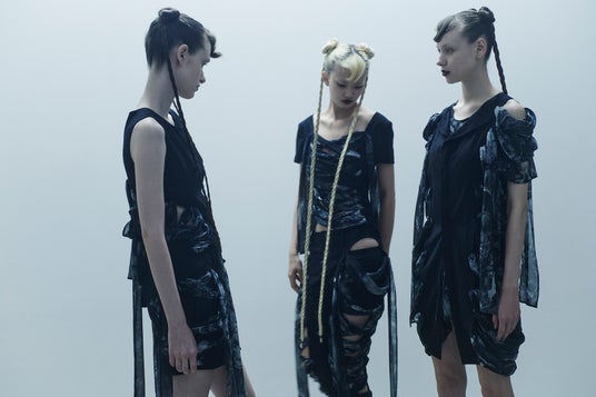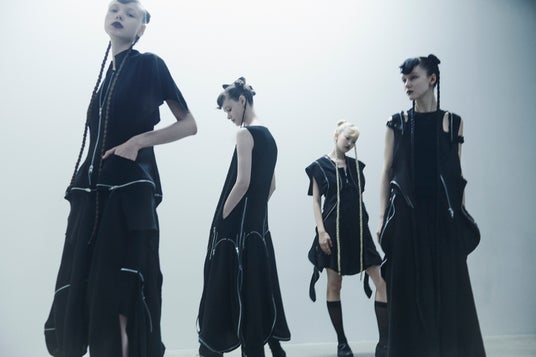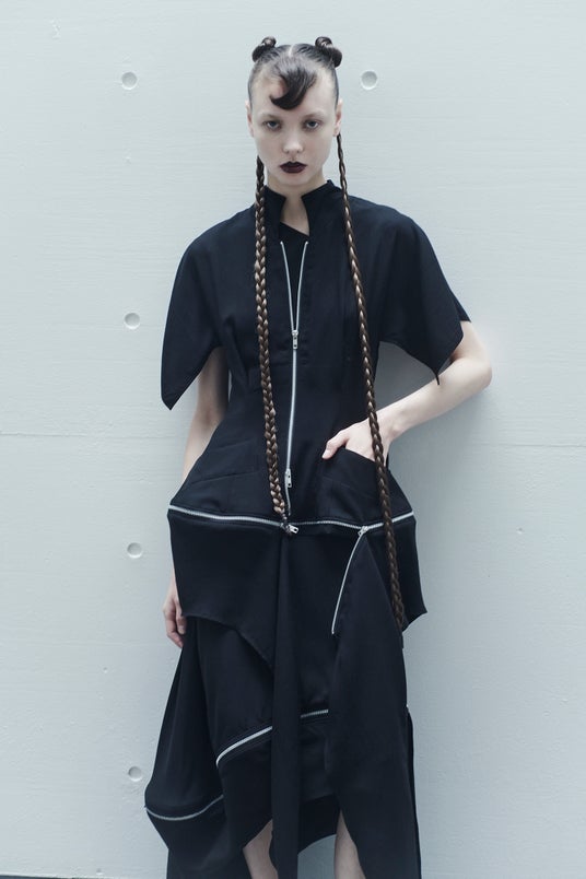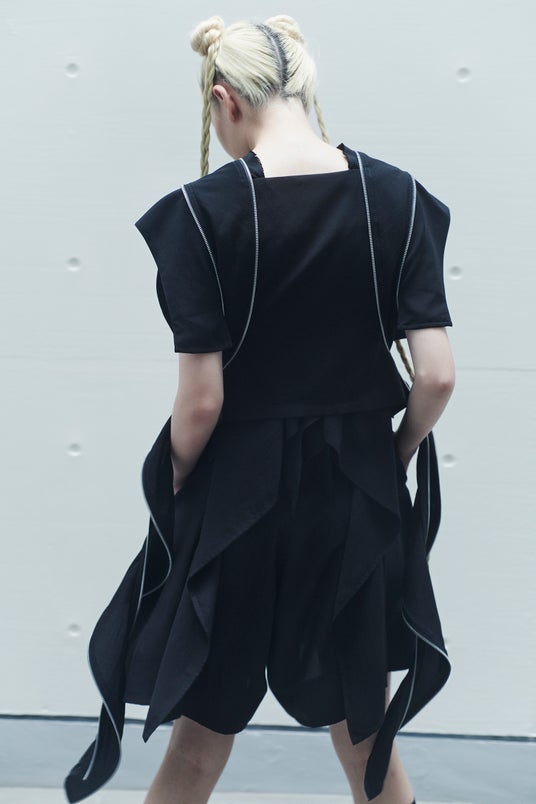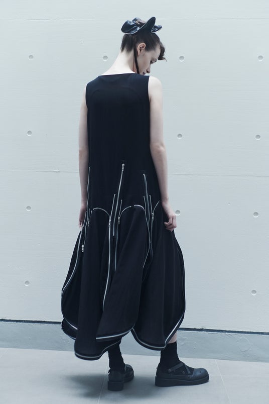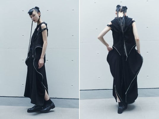 前中心にWファスナー、コルセットシルエット、背中心に配した3本のWジッパーのレイヤード