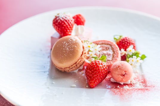 3/6までは各コースに+1,000円でいちごデザートにグレードアップ。いちごのアイスやロールケーキを飾ったキュートな一皿「苺のヴァリエ アシェットフリュイルージュプランタン」が期間限定で登場いたします。