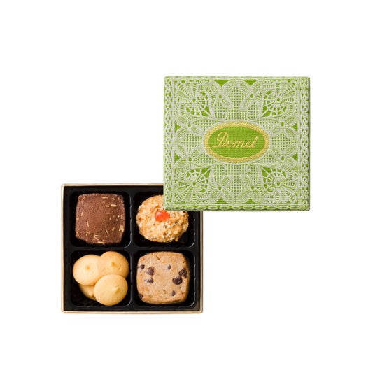 『アソートクッキー (スプリング)』は、デメルのクッキー4種を春らしい若草色のレース模様の限定パッケージに詰め合わせた商品。香辛料、ナッツ、レモンなどの風味豊かで個性的なクッキーをお楽しみいただけます。