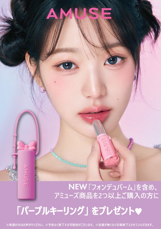 対象の店舗(※2)で「フォンデュバーム」を含めたアミューズ商品を2つ以上ご購入のお客様に、フォンデュバームを入れて持ち歩けるトレンディな「パープルキーリング」を先着贈呈いたします。