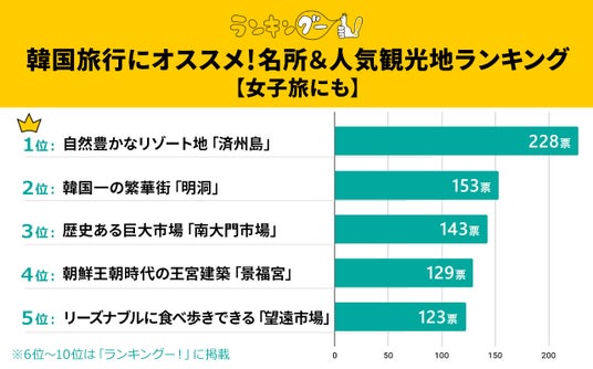 1位は自然豊かなリゾート地「済州島」に決定!2位は韓国一の繁華街「明洞」。3位は歴史ある巨大市場「南大門市場」。4位は朝鮮王朝時代の王宮建築「景福宮」。そして、僅差で5位はリーズナブルに食べ歩きできる「望遠市場」がランクインしました!
