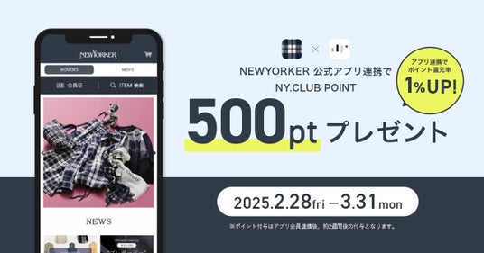衣料事業の主力ブランドNEWYORKERを中心とした衣料服飾品の企画、製造、販売、不動産の売買、仲介、賃貸管理を行っている株式会社ダイドーフォワード(本社:東京都千代田区/代表取締役:成瀬 功一郎)は、ニューヨーカーアプリ連携するとNY.CLUB「500PT」プレゼントするお得なキャンペーンを2/28(金)~3/31(月)まで開催いたします。