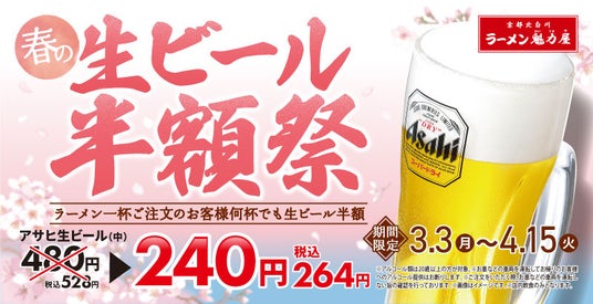 京都北白川ラーメン魁力屋をチェーン展開する株式会社魁力屋(https://corp.kairikiya.co.jp/本社:京都市中京区、代表取締役社長:藤田 宗、以下魁力屋)は、「春の生ビール半額祭」を2025年3月3日(月)~4月15日(火)の期間で開催いたします。
