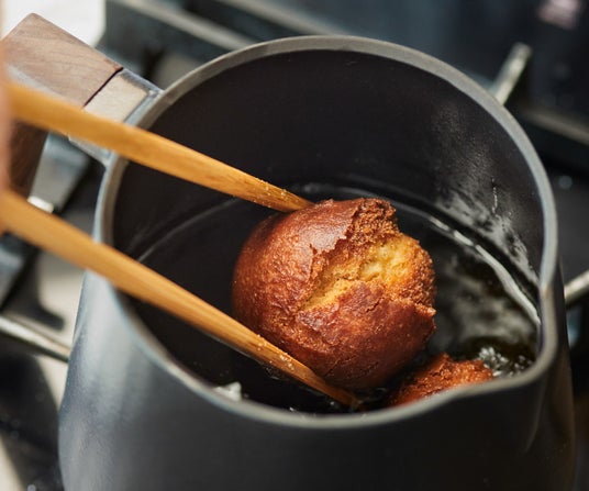 コンパクトで深さのある形状だから、少量の油で揚げられる上、油の飛び散りを気にせず、揚げ物も気軽に楽しめます。蓄熱性が高く、油を高温でキープできるので、カラッとおいしく揚がるのもスープポットならでは。