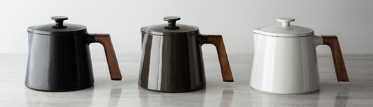 スープポットは、直径11.8cm、容量1.9Lのワンサイズ。1~2人分の調理におすすめです。鋳物ホーローとウッドが組み合わさったスタイリッシュな佇まいは、どんなキッチンにも馴染みます。コンパクトで収納にも困りません。