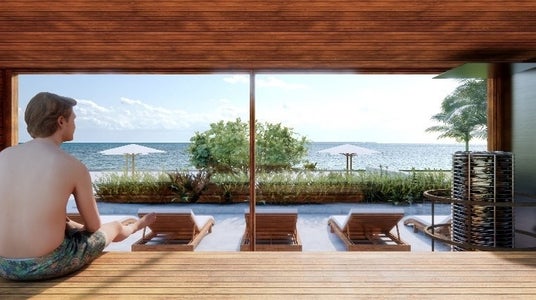 クワイエットプールには、サウナクリエイティブ集団TTNE社監修のダイナミックなパノラマビューが特徴のサウナ「SAUNA BLOCK(サウナブロック)」を国内で初めて採用し、冬季でも暖かい南国ビーチリゾートの新しいウェルネス体験をご提供いたします。
