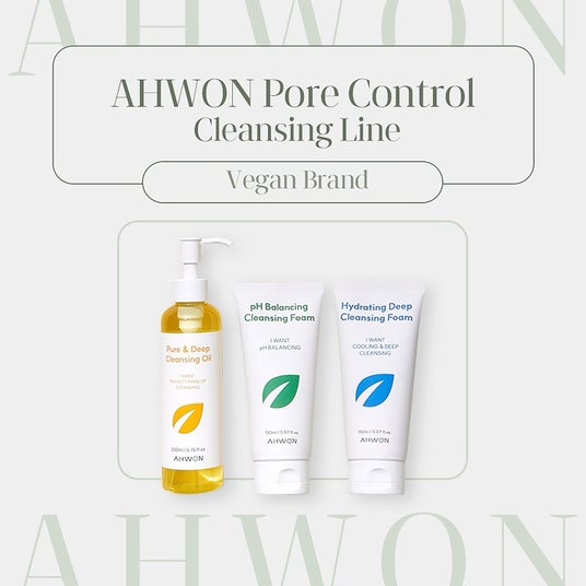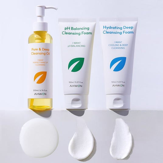 画像左より:AHWON ピュア&ディープクレンジングオイル、AHWON pHバランシングクレンジングフォーム、AHWON ハイドレーティングディープクレンジングフォーム