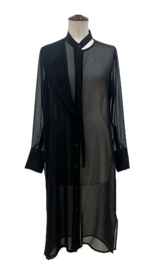 上品な透け感のシフォンワンピース。襟と一体化した細長いボウと身頃のレイヤードがポイント。シフォン(ポリエステル)