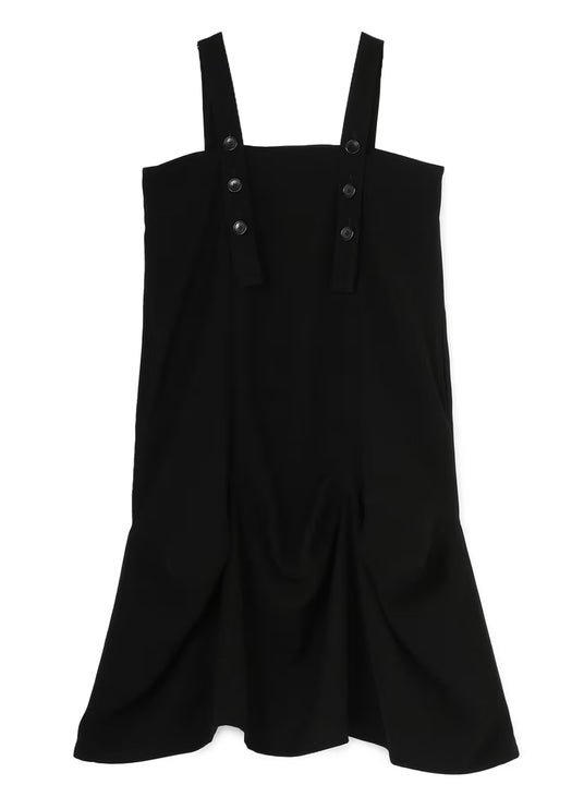 前身頃と後ろ身頃のダーツによるゆるやかなドレープ。ニュアンスのあるヘムラインが特徴。ショルダーストラップに配された6釦がアクセント。ダブルサテン