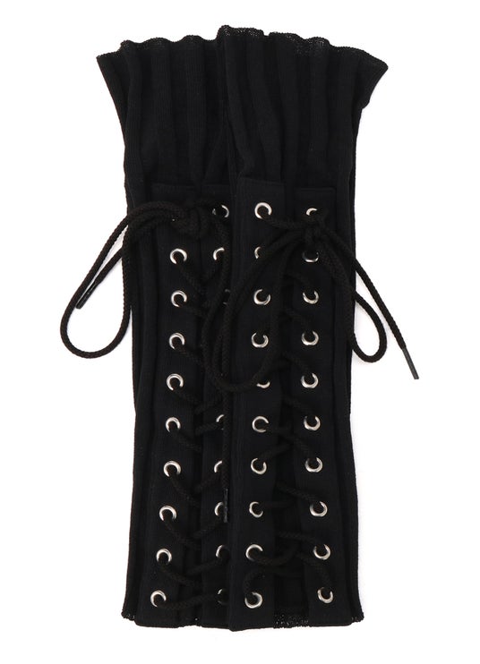 細かく配された丸カンがポイントのレースアップウォーマー。アーム・レッグ兼用。ストレッチリブ(レーヨン・ナイロン)*長さ31.5cm (写真ではレッグウォーマーとして着用)