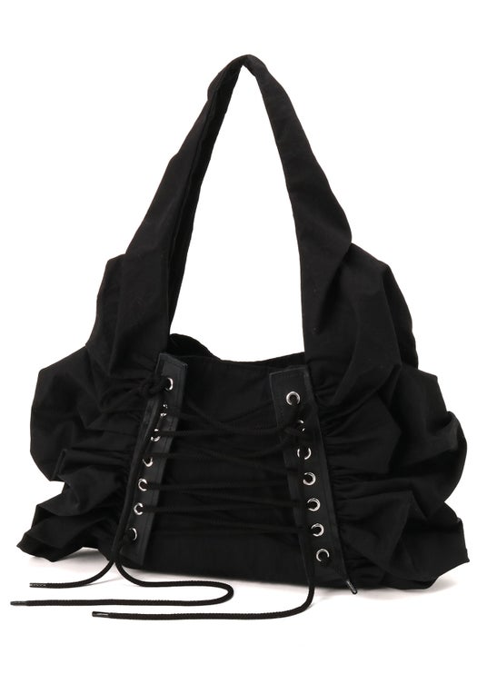コルセットのようなレースアップデザイン。バック幅の調整が可能。ギャザーを配していることで馴染みやすい曲線シルエット。安定したワンハンドル仕様でショルダーがけも可能。コットンナイロンウェザー *縦20×横24×マチ8.5×持ち手58cm