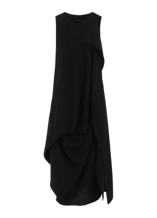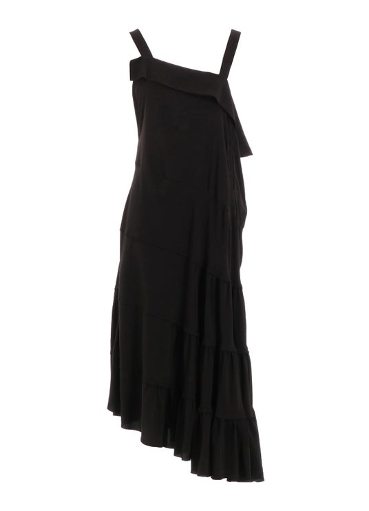 デシンの微光沢によりティアードディティールが際立つアシンメトリードレス。両脇がV開きになっており、インナーによって異なるスタイルが可能。デシン(トリアセテート・ポリエステル)*総丈113/133cm