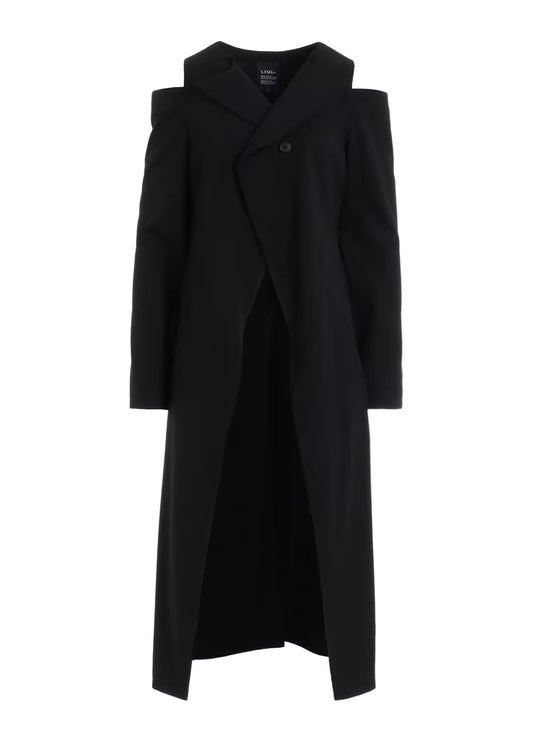 両肩先をカットしたワンピース兼ロングジャケット。両袖の内側にスラッシュカット仕様。ウールギャバジン