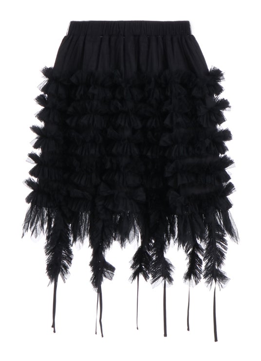 チュール密度の高いミニ丈スカート。黒テープのドロースタイルがパンキッシュ。ポリエステル *総丈45/55×W62×H125 cm