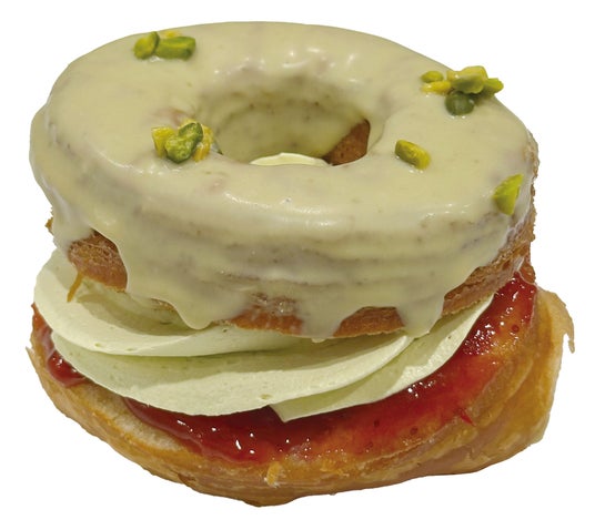 いちご×ピスタチクロワッサンドーナツ 360円 クロワッサンドーナツにピスタチオチョコをコーティング。ピスタチオクリームと酸味たっぷりの贅沢ないちごのコンフィチュールをサンド。