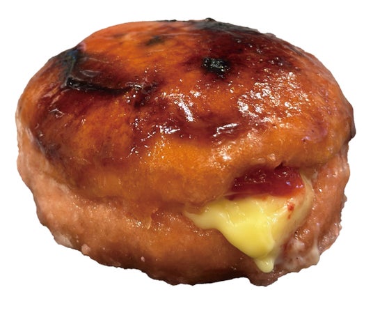 まるごといちごブリュレ 340円人気No.1のブリュレドーナツにいちごの酸味たっぷりなグレーズと果肉、カスタードを入れた、いちごをリッチに味わうドーナツ。