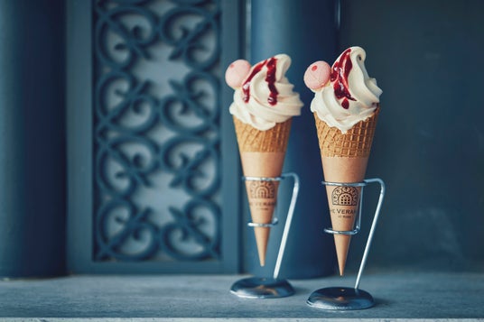 – ガーデンソフトクリーム -苺ミント-(550円) ミックスベリーのソースとマカロン(バニラチェリー)を添えて