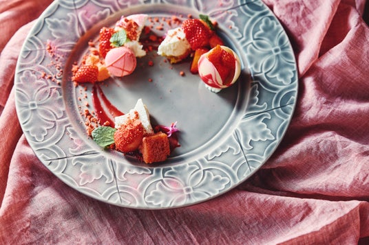 – 季節のクリエーション(1,830円) 旬の苺をふんだんに使用し春を表現した一品(苺、レアチーズケーキ、チョコレートカップ、マカロン、苺パウダー、ミントもしくはセルフィーユ、エディブルフラワーなど)