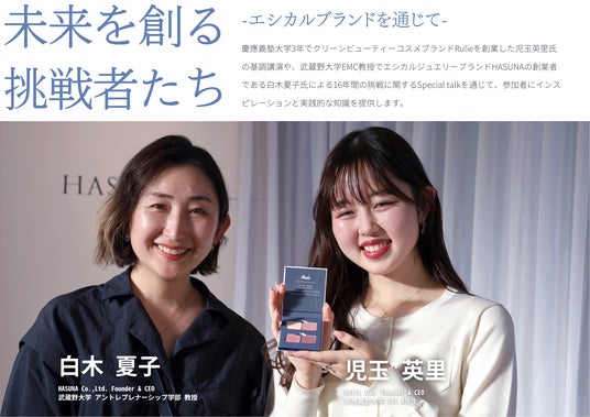 慶應義塾大学在学中でエシカルコスメブランドRulieを創業した児玉英里の講演や、武蔵野大学EMC教授でエシカルジュエリーブランドHASUNAの創業者である白木夏子氏によるSpecial talkを通じて、インスピレーションと実践的な知識を提供いたします。また、両氏によるパネルディスカッションからエシカルビジネスの可能性について議論し、ネットワーキングセッションを通じた若者同士の交流と協力関係の構築を促進します。