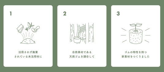 このたびフェアトレードの天然ゴムに、食品業界で廃棄される「海苔の端材」「お茶の端材」「卵の殻」といった未活用材をそれぞれ混合することで、3種類の新素材を開発しました。