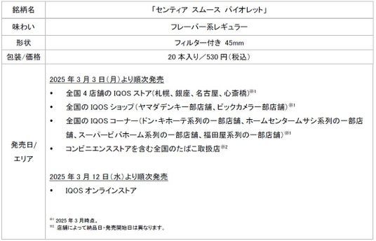 フィリップ モリス ジャパン合同会社(本社:東京都千代田区、社長:シェリー・ゴー、以下「PMJ」)は、加熱式たばこ IQOS ILUMA i(イルマ アイ)およびIQOS ILUMA(イルマ)専用たばこスティック「SENTIA(センティア)」から「センティア スムース バイオレット」を、2025年3月3日(月)より、IQOSオンラインストア、全国4店舗のIQOSストア※、IQOSショップ(ヤマダデンキ一部店舗、ビックカメラ一部店舗)、IQOSコーナー(ドン・キホーテ系列一部店舗他)、コンビニエンスストアを含む全国のたばこ取扱店にて順次発売いたします。