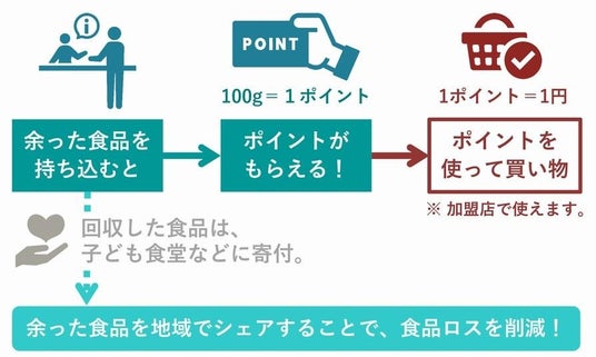 さいたま市民がご家庭で余った食品を市内の回収拠点(2か所)に持ち込むと、100gごとに1ポイントのデジタル地域通貨「たまポン」が貯まります。 ポイントはさいたま市内の約1,400か所(令和7年2月21日時点)の加盟店で使えるため、市民が日常生活で直接的なメリットを感じながら、社会貢献もできる仕組みです。この取り組みにより市民への食品ロス削減の取組を一層普及させるとともに、地域福祉にも貢献していきます。