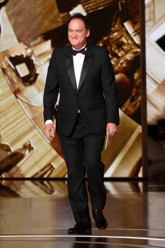クエンティン・タランティーノは、メンズ コレクションからブラックウールとシルクのピークドラペルタキシードに、ホワイトコットンのウィングチップカラーシャツを纏い、ブラックシルクの蝶ネクタイと、ブラックパテントレザーのダービーシューズを合わせました。