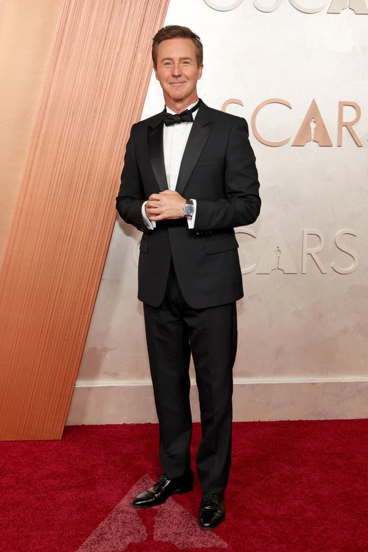 エドワード・ノートンは、メンズ コレクションからブラックウールとシルクのピークドラペルタキシードに、ホワイトコットンのウィングチップカラーシャツを纏い、ブラックシルクの蝶ネクタイと、ブラックパテントレザーのダービーシューズを合わせました。
