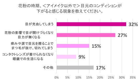 花粉の時期はそもそもアイメイクの悩み以前に目元が盛れなくなる要因が多くあります。アイメイク以外の目元の悩みを質問したところ、「目が充血してしまう」と回答した人が最も多い結果になりました。「痒みや涙で目を擦ることでまつ毛が抜け、切れてしまう」という、まつ毛に関する悩みの声も多く挙がりました。