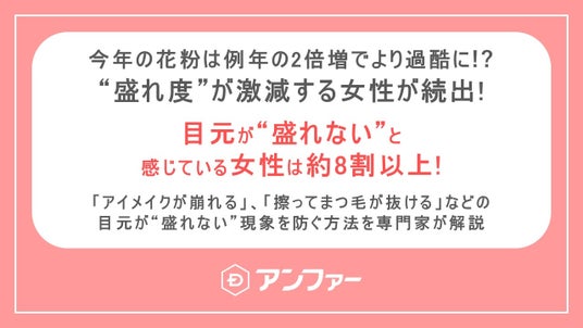 アンファー株式会社(本社:東京都千代田区、代表取締役社長:吉田南音 以下「アンファー」)が展開する「スカルプDまつ毛美容液」ブランドでは、全国の女性300名(実施期間:2025年2月、20~40代)を対象に、「花粉による目元のコンディション低下」に関する調査を実施しました。調査の結果を踏まえ、花粉時期の様々な“目元が盛れない”現象を防ぐ方法を専門家が解説いたします。