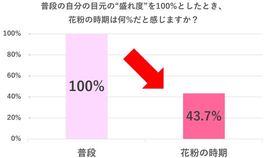 2.普段の自分の目元の“盛れ度”を100%としたとき、花粉時期は平均43.7%に減少。