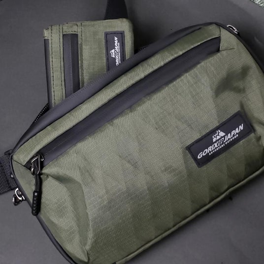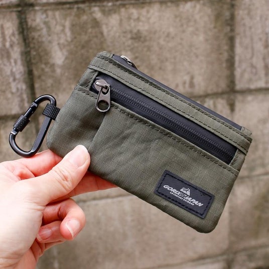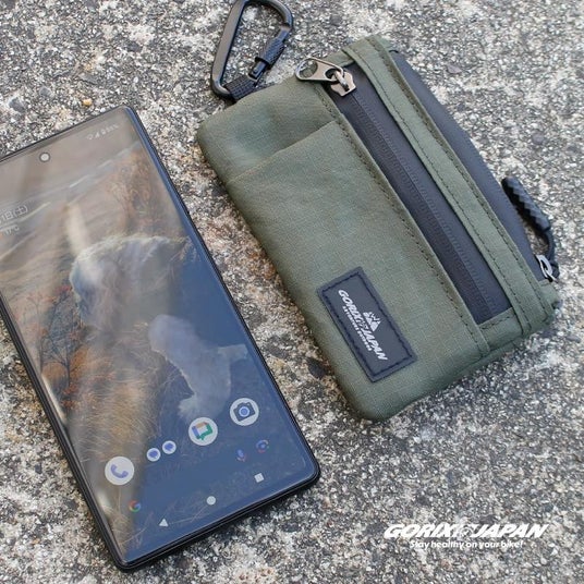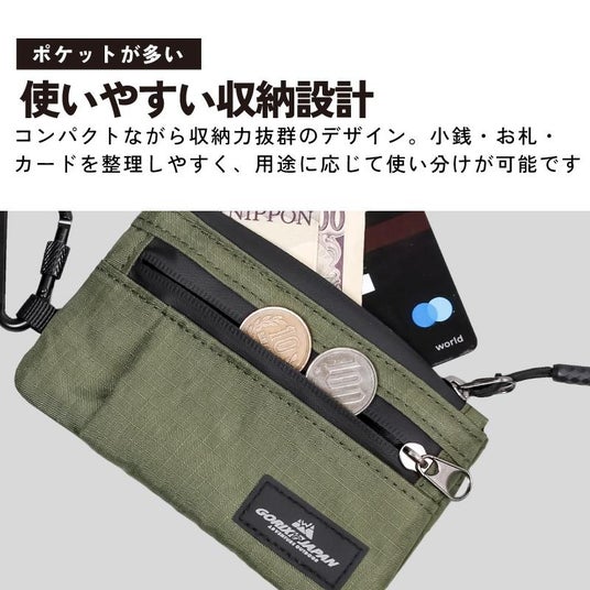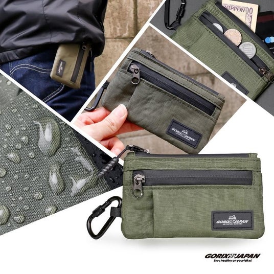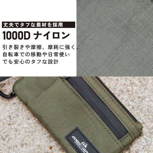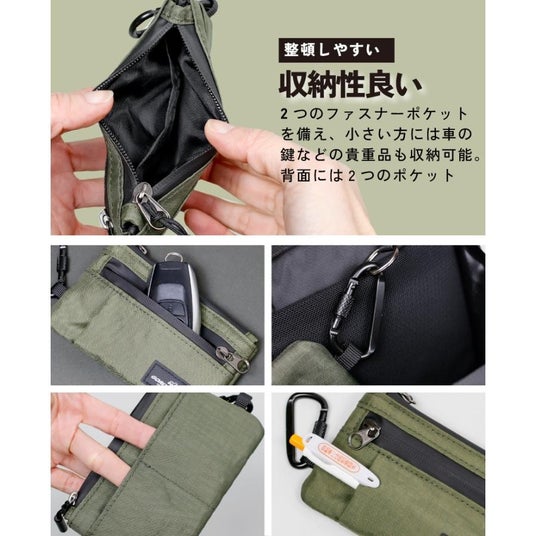 ロック機能のカラビナ、防水撥水性、スリム薄め
